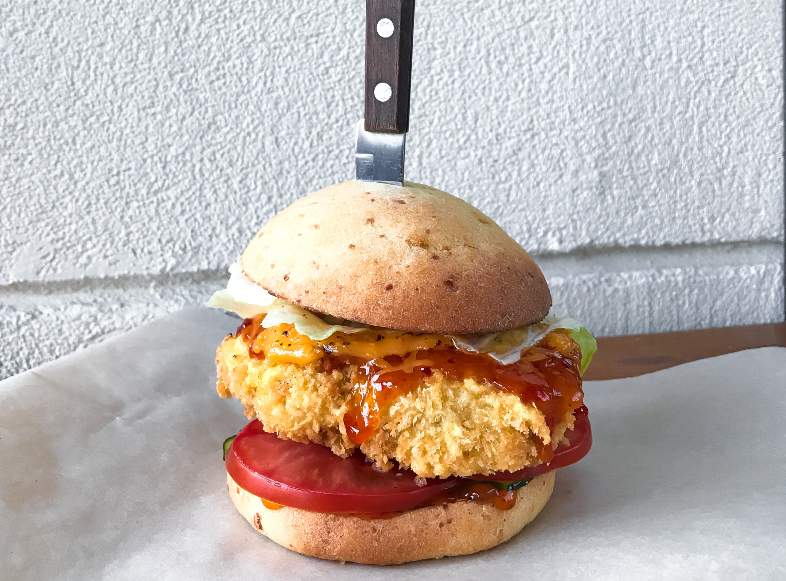 Куриное филе в панировке, соус сладкий чили, огурец, томат, салат, сыр чеддер.