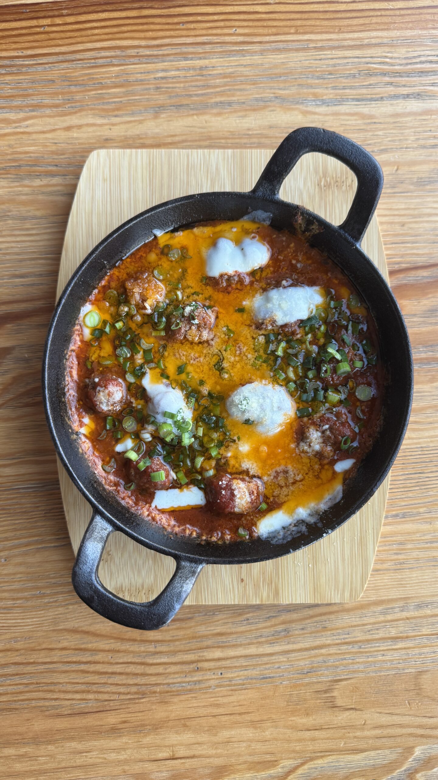 Сковородка фрикаделек из мраморной говядины в томатном соусе со специями и моцареллой.