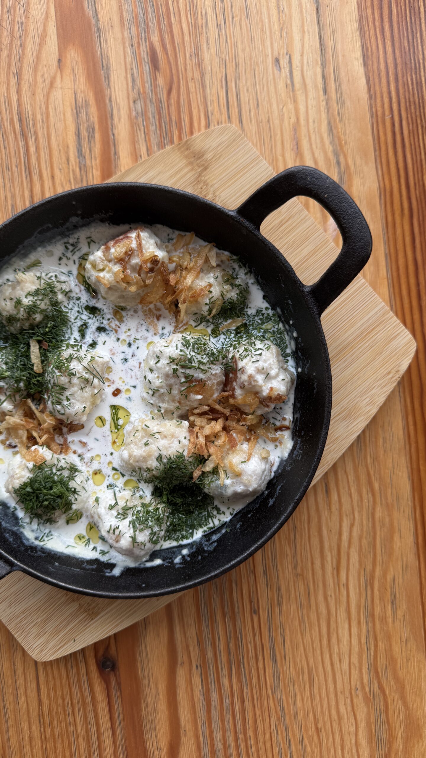Фрикадельки из куриного филе, сливочный соус, специи, сыр моцарелла и зелень