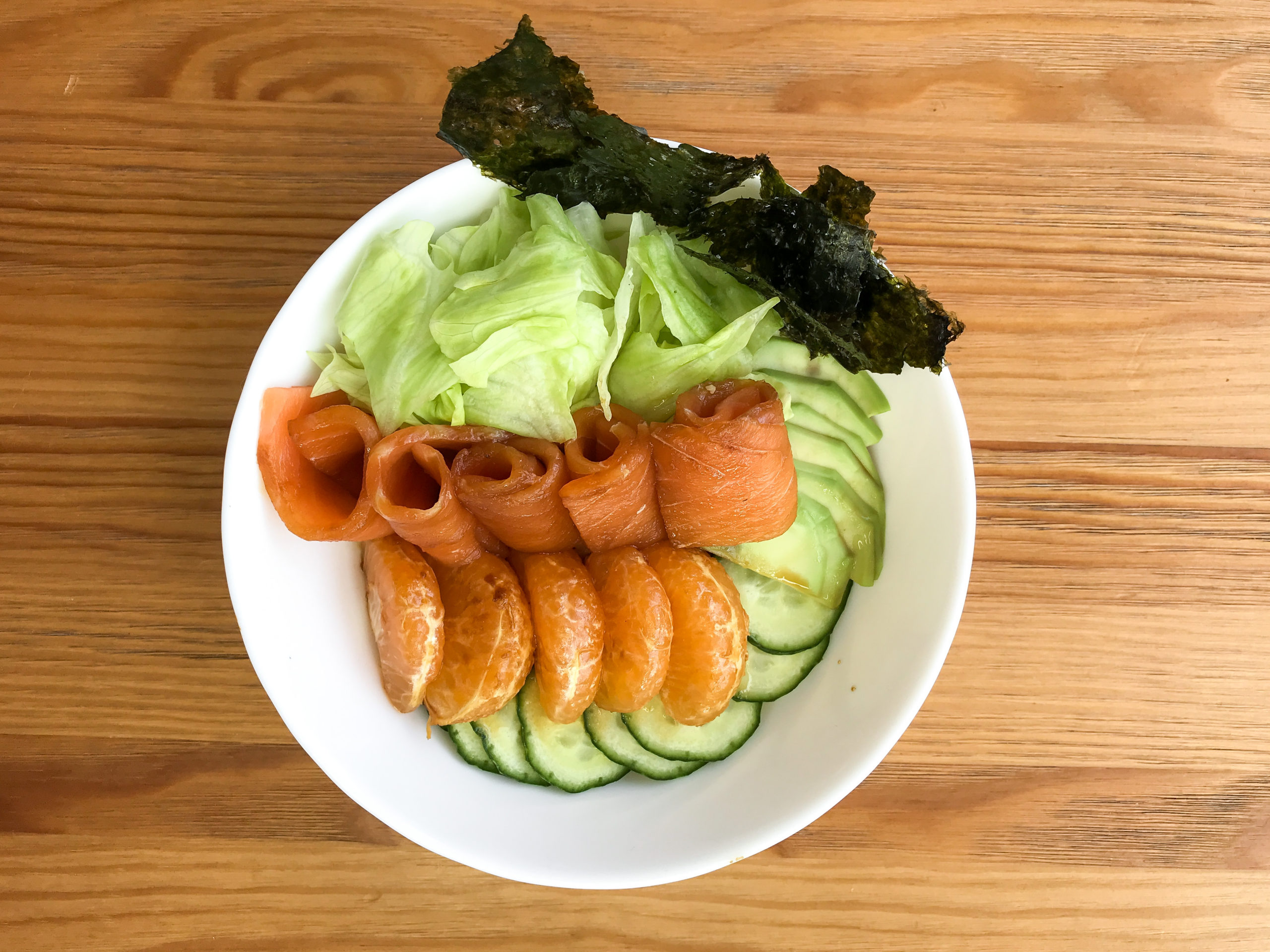 Рис, лосось, манадрин, листья салата, огурец, нори.
