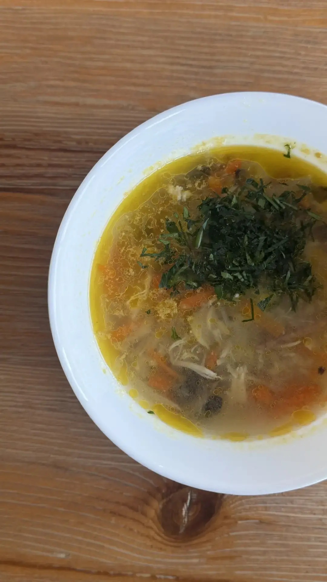Куриный бульон, шампиньоны, вешенки, курица копченая, салями, лук репчатый, морковь, картофель, чеснок, зелень.