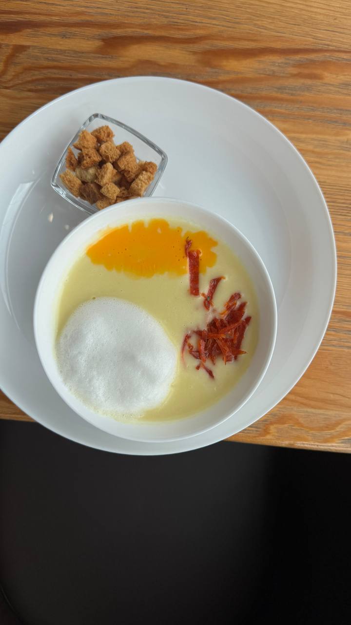 Куриный бульон, картофель, лук репчатый, сливки, чеддер, чоризо, гренки, молочная пенка