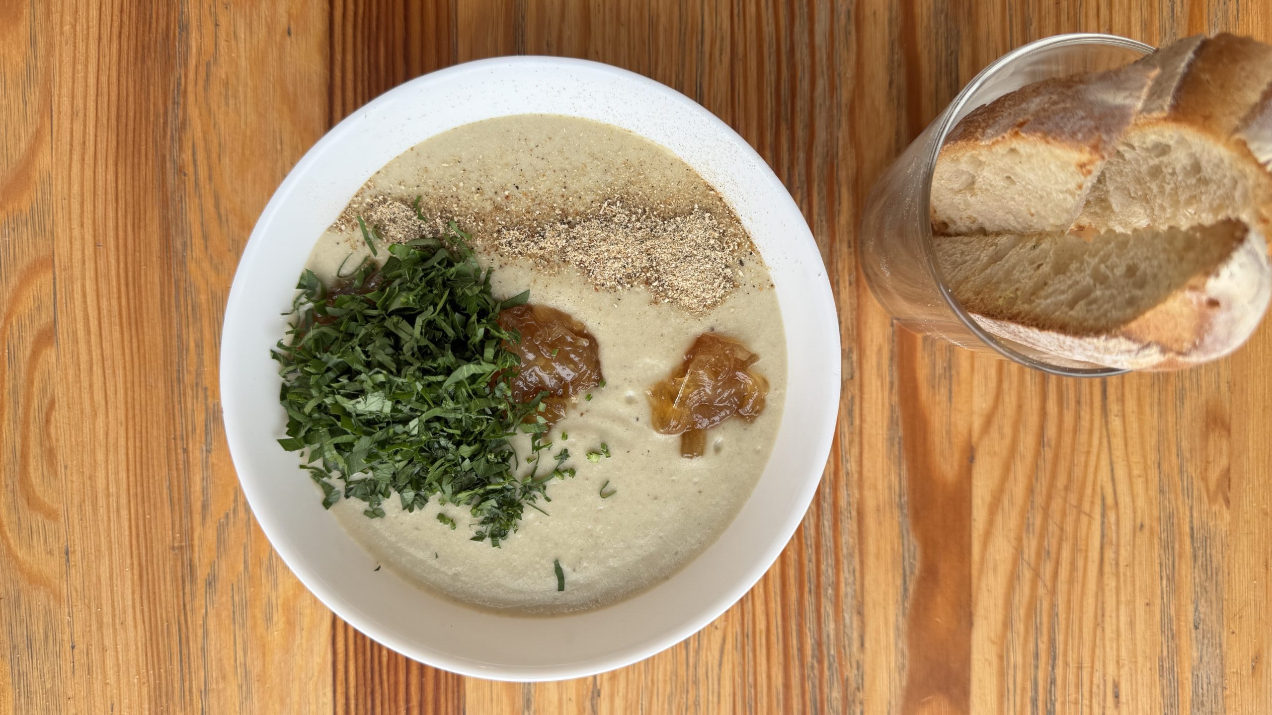 Куриный бульон, картофель, шампиньоны, вешенки, сливки, луковый мармелад, петрушка, пудра из белых грибов. Подается с чиабаттой.