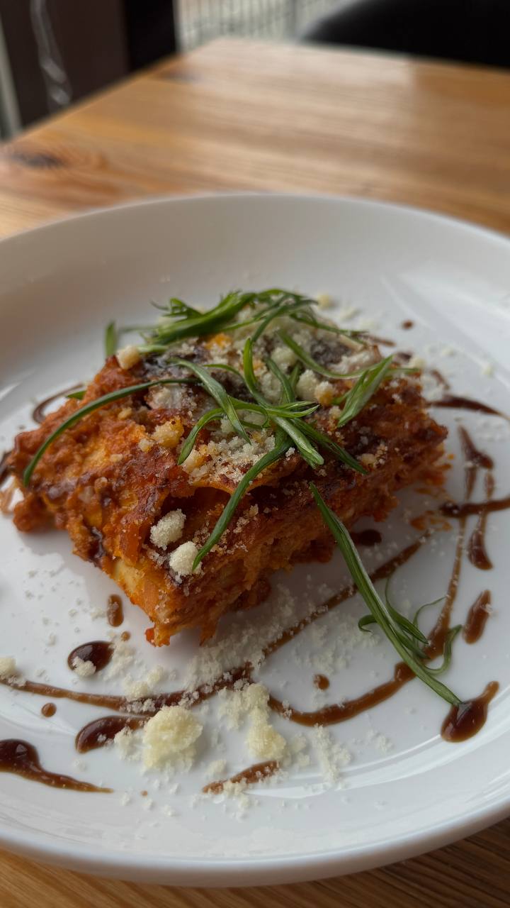 Паста с соусом бешамель и болоньезе, базиликом, чесноком и пармезаном