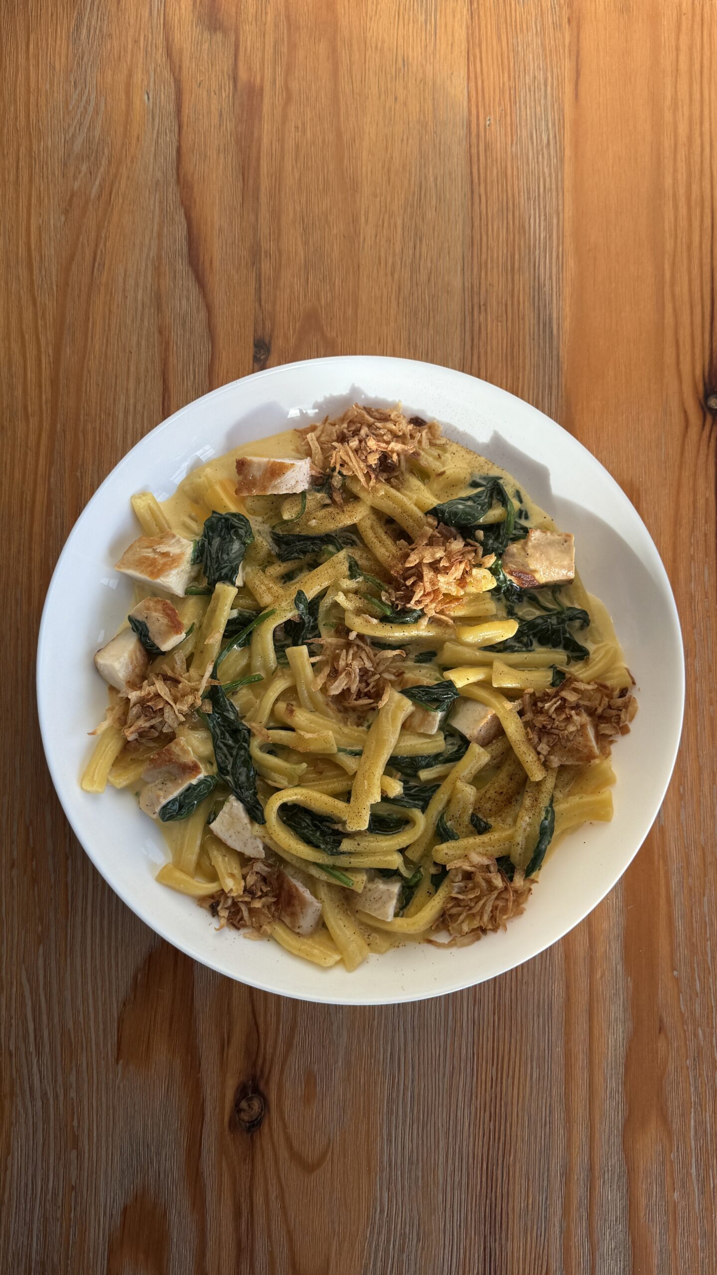 Паста казаречче, курица, шпинат, сырный соус, чеснок и хрустящий лук.