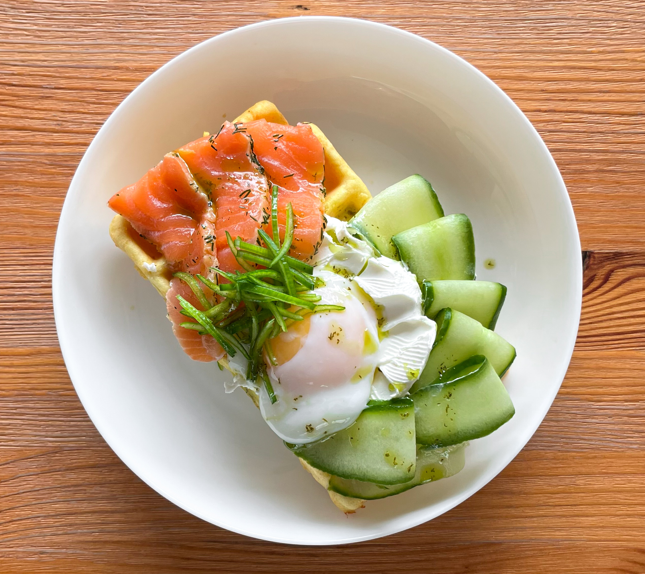 Несладкая вафля с лососем, огурцом, сливочным сыром и яйцом пашот