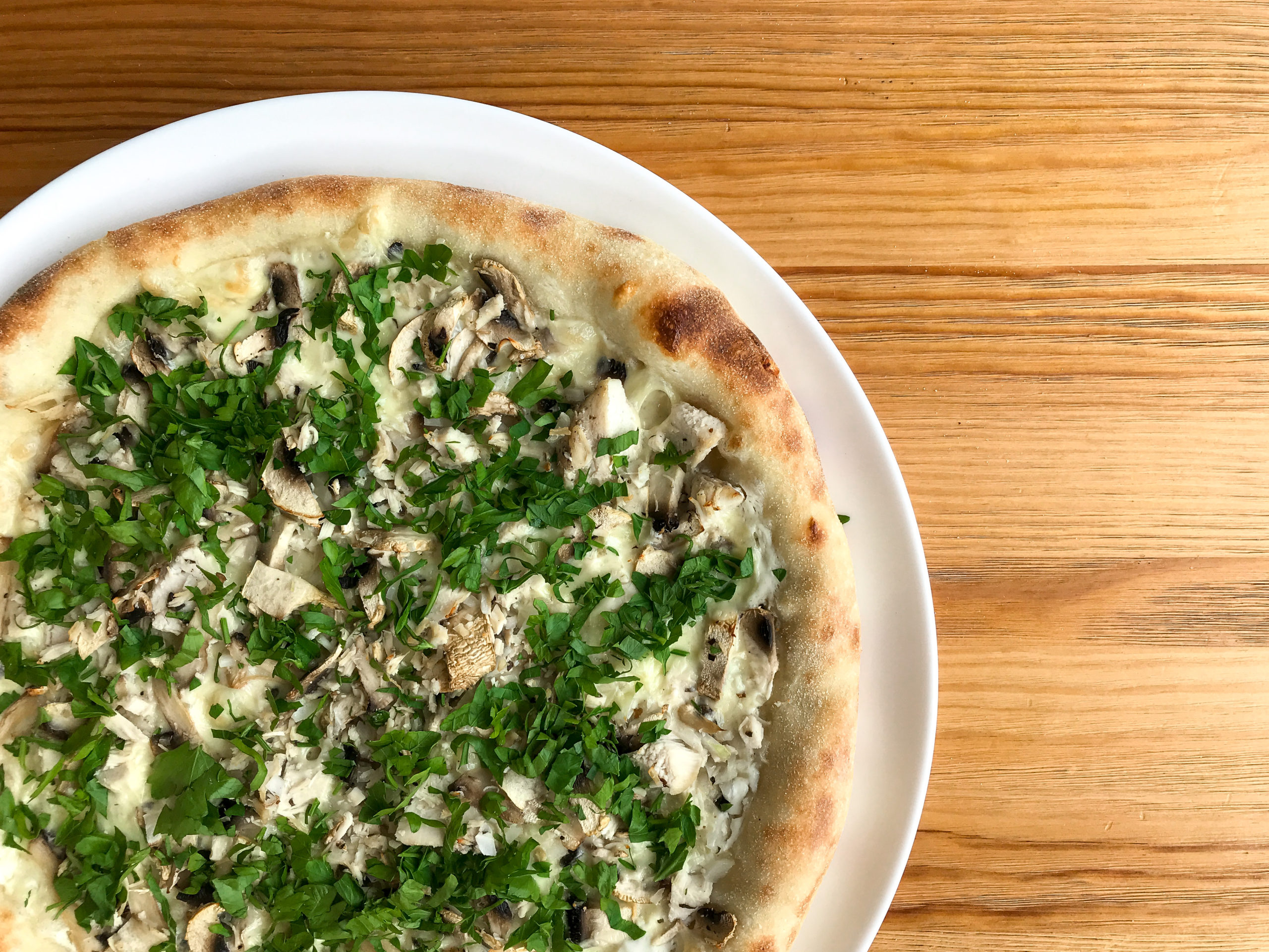Тесто, сливочный соус, сыр моцарелла, курица копченая, лук репчатый, шампиньоны, петрушка.