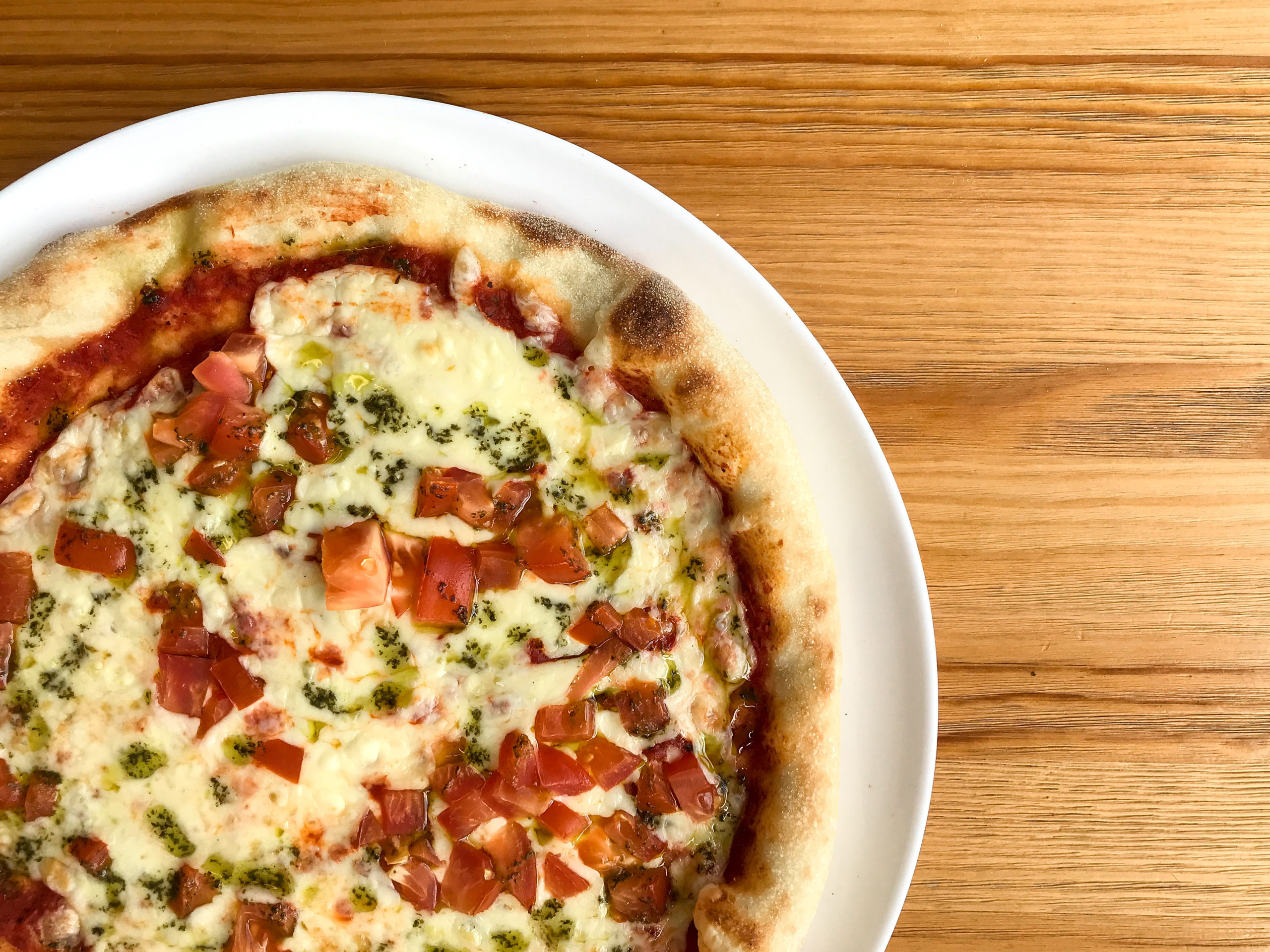 Тесто, томатный соус, сыр моцарелла, томаты, базиликовое масло.