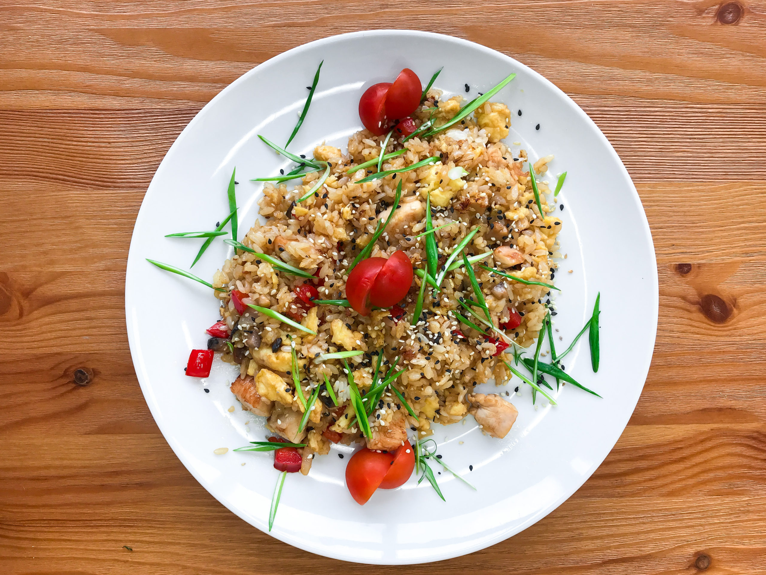 Рис, куриное филе, омлет тамаго, перец болгарский, шампиньоны, лук репчатый, чеснок, соевый соус, кунжутное масло, кунжут, лук зеленый,  томаты черри.
