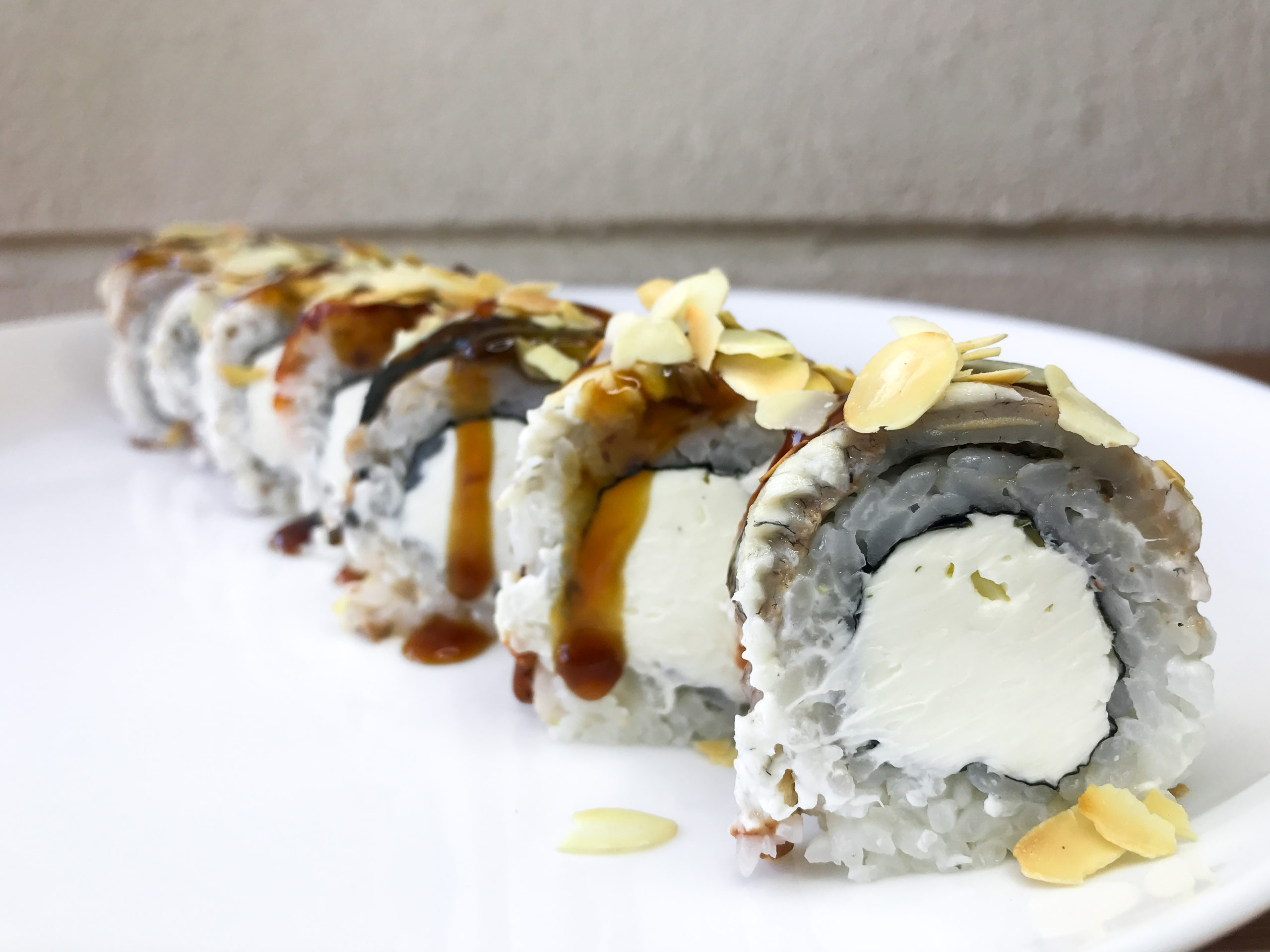 Внутри: сливочный сыр. Сверху: угорь, соус терияки, хлопья миндаля.