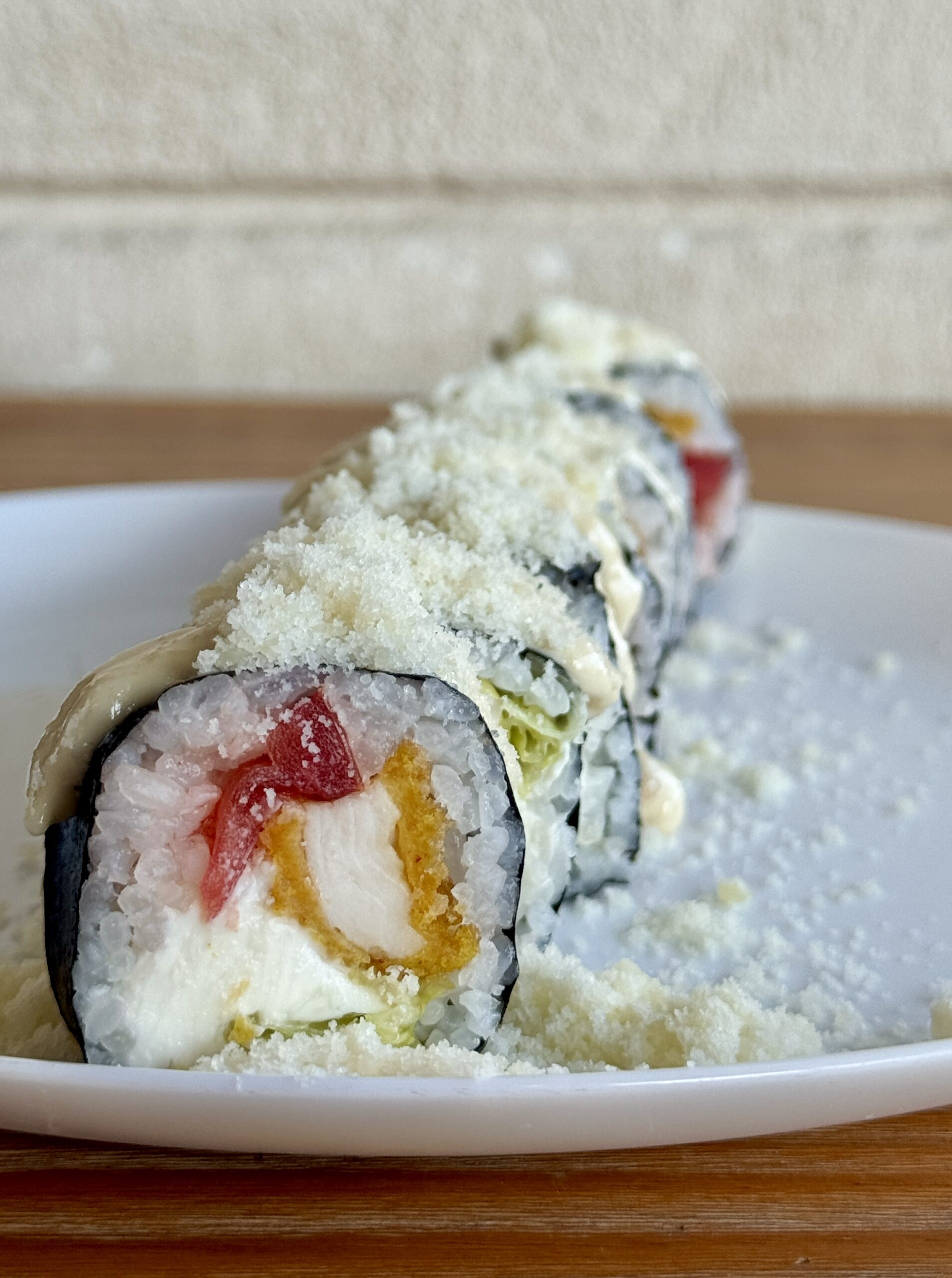 Внутри: сливочный сыр, томат, курица в панировке, салат. Сверху: соус цезарь и пармезан.
