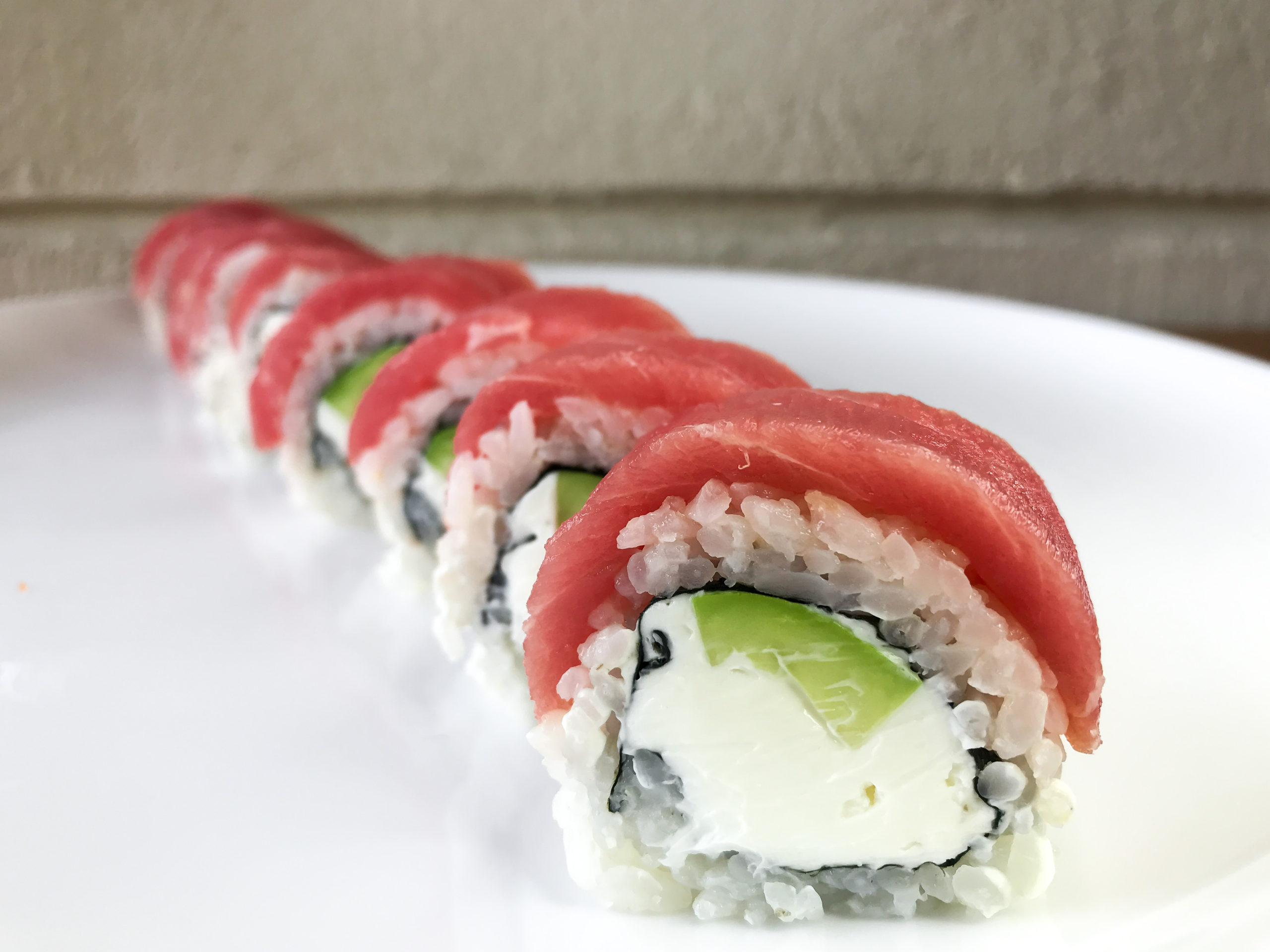 Внутри: сливочный сыр, авокадо. Сверху: тунец.