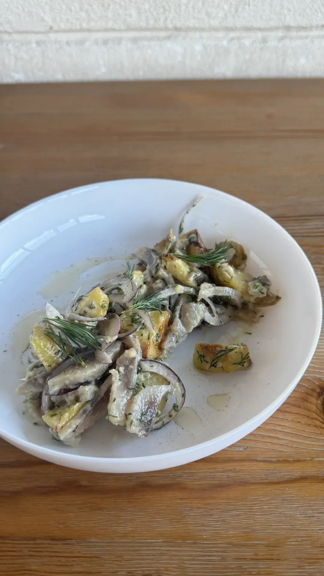Картофель запеченый, сельдь соленая, лук красный, яйцо куриное, горчичный соус, укроп.