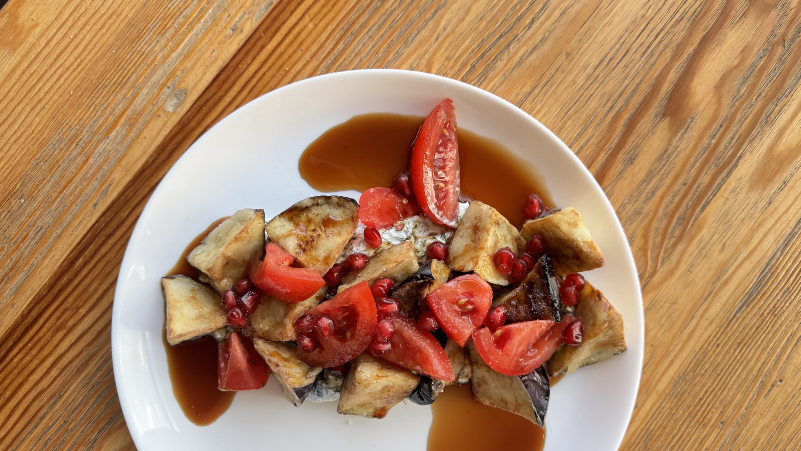 Баклажан в панировке, дзадзики, томат, гранат, гранатовый соус