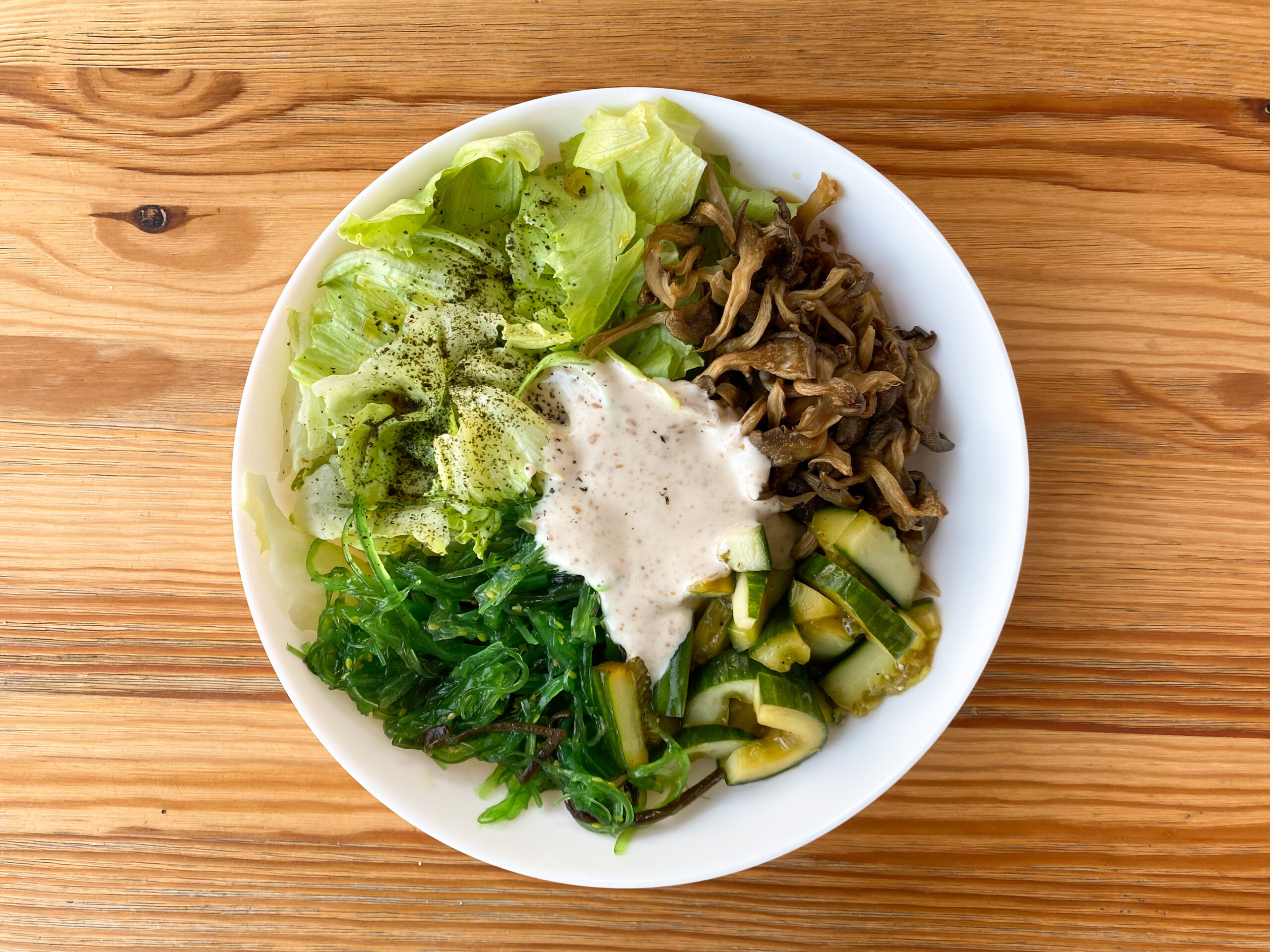 Листья салата, битые огурцы, обжаренные вешенки, чукка, ореховый соус, кунжутное масло, пудра нори.