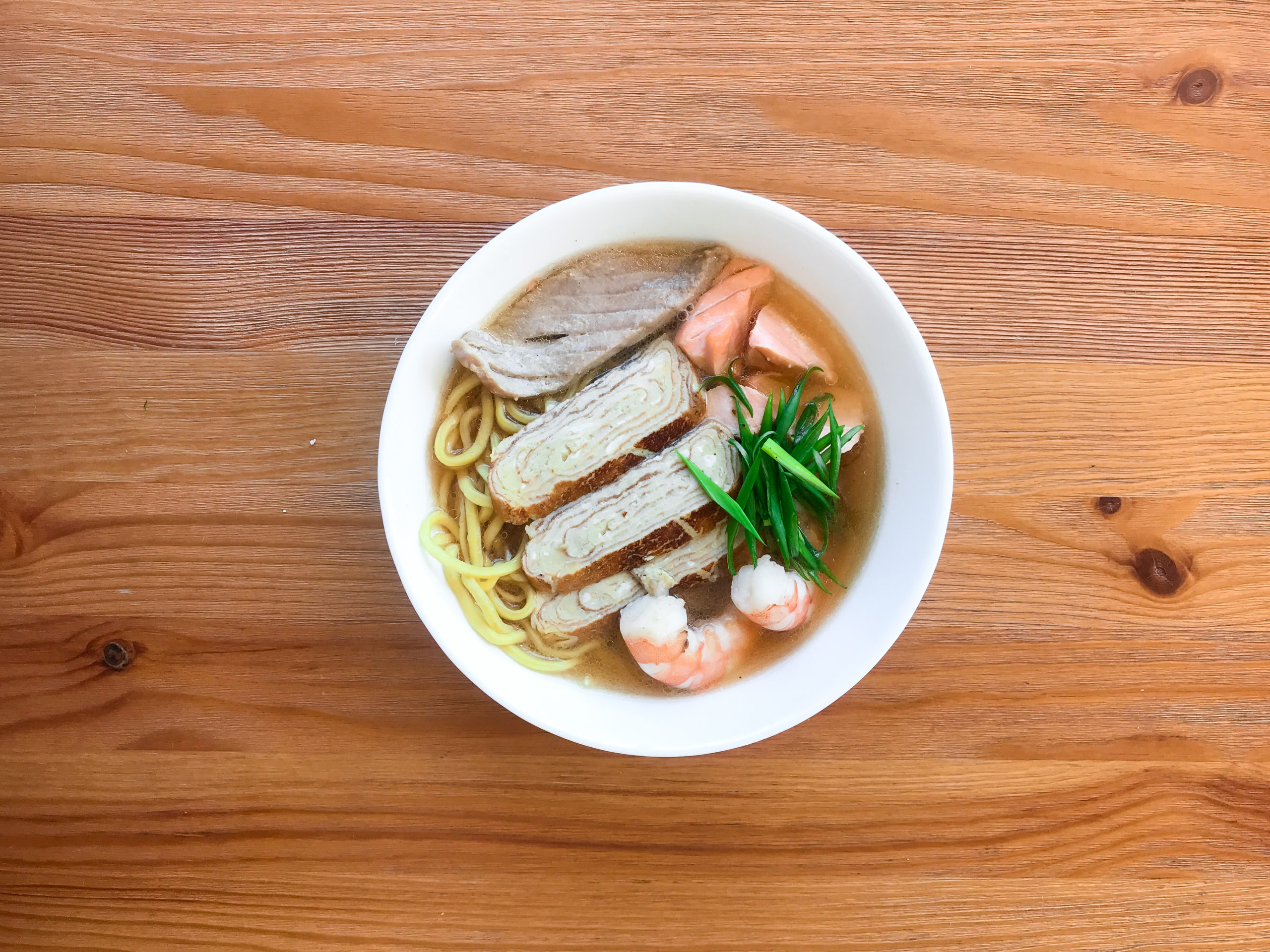 Рыбный бульон, лапша рамен, омлет тамаго, креветки тигровые, лосось, тунец, соевый соус, лук зеленый.