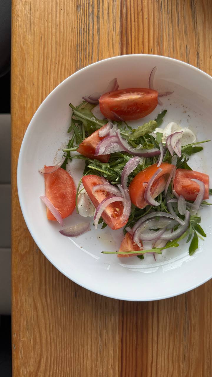 Томат, сливочный сыр, руккола, красный лук, масло оливковое