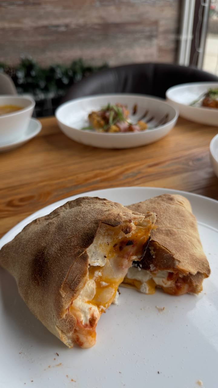 Тесто, томатный соус, моцарелла, чеддер, сливочный сыр, чеснок